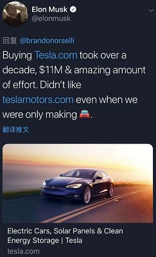 近日關(guān)于這枚域名交易的具體金額終于有了實(shí)錘!特斯拉創(chuàng)始人馬斯克發(fā)文透露說(shuō)他花了10年以上時(shí)間和很多精力才在2016年以1千1百萬(wàn)美元的價(jià)格拿下Tesla.com域名,以替換原有的TeslaMotors.com域名。