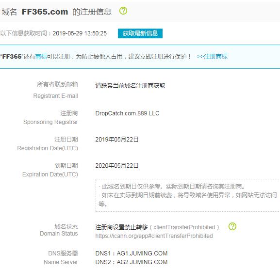 根據(jù)Whois信息查詢,域名FF365.com最早注冊(cè)于2005年3月,由于設(shè)置了隱私保護(hù),最早的持有者信息我們無(wú)法獲悉。之后因?yàn)?/span>沒(méi)有及時(shí)續(xù)費(fèi),該域名在5月22日被重新注冊(cè)了,于5月26日更新了相關(guān)信息。