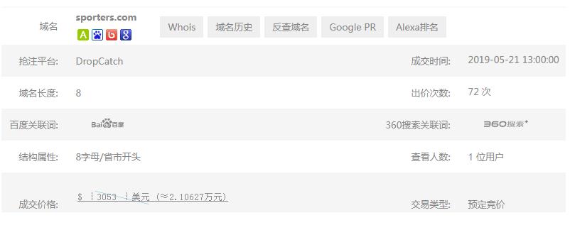 無(wú)獨(dú)有偶,不久前域名Sporters.com同樣因?yàn)?/span>沒(méi)有續(xù)費(fèi),以至于過(guò)期刪除被重新競(jìng)拍,并在今年5月中旬以3053美元的價(jià)格被拍走,而此域名在2015年曾以20000美元的價(jià)格售出,完成交易后持有者開(kāi)啟了隱私保護(hù)至今!
