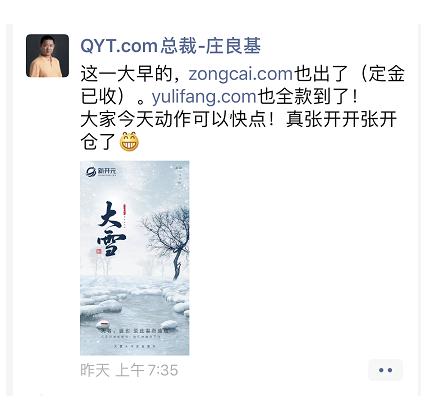 據了解,賣家是著名的域名投資專家莊良基,為了給自己在今年雙十一啟動的新項目“企友通(QYT.com)”回籠資金,開始開倉特價出售一批域名,其中雙拼域名zongcai.com已經被人預定,定金已經到賬。三拼域名yulifang.com已交易完畢。此外,還有5個域名已經打包100多萬交易。前日中午12點左右,還有一枚雙拼域名50萬價格交易,具體域名不知。