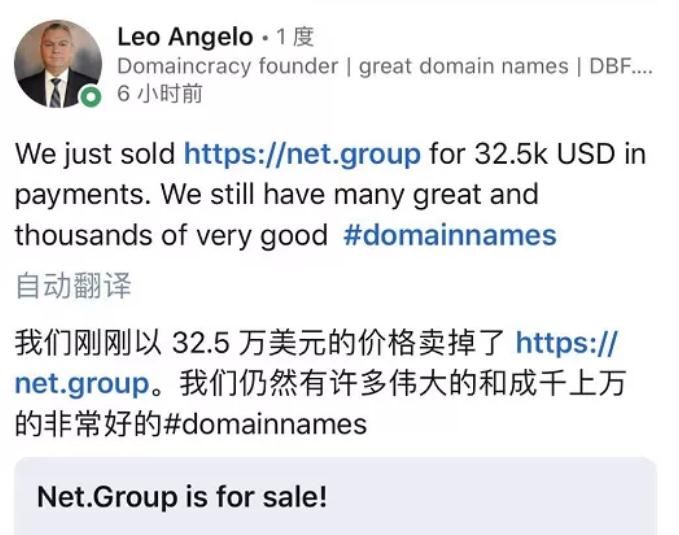 近日,單詞域名net.group以32.5萬(wàn)美元售出,約合人民幣207萬(wàn)元!