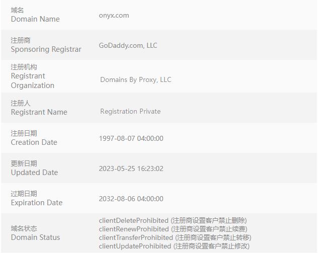 查詢whois發現,域名Onyx.com注冊時間為1997年8月,至今已有近26年的歷史,屬于歷史悠久的老域名。域名"Onyx"對標“縞瑪瑙”以及“onyx蛋糕;onyx樂隊”等知名品牌,這些品牌與Onyx的相關性為該域名賦予了額外的商業價值,進一步吸引了潛在買家的興趣。